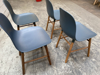 Blå plast skal og ben i valnød - Nogle af stolene er der farveforskel på benene. Har desuden prik på skallen hvor man kan se hvor stellet er monteret under.