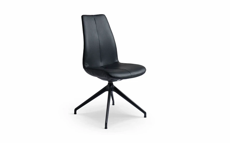 Det stilrene sæde rummer en gennemtænkt komfortdetalje i form af en indbygget vippefunktion, der giver kroppen mulighed for at bevæge sig naturligt og mindsker belastningen ved længere tids brug. Det sortlakerede stel med returdrej tilfører både funktionalitet og æstetik, da stolen automatisk vender tilbage til sin udgangsposition, når du rejser dig, og dermed skaber et roligt og ryddeligt udtryk omkring bordet.