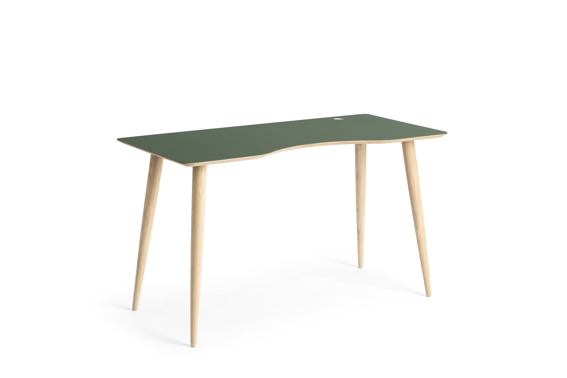 De slanke ben i naturfarvet eg giver skrivebordet varme og et nordisk præg, samtidig med at de sikrer en stabil og elegant konstruktion. Bordets bløde mavebue giver ekstra komfort og bedre plads, når du sidder ved skrivebordet, mens det diskrete kabelføringshul placeret i højre side gør det nemt at holde styr på ledninger og skabe et ryddeligt udtryk.
