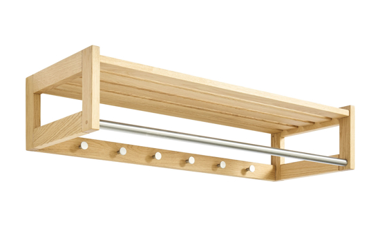Hylden kan monteres i den højde, der passer bedst til dit behov, hvilket giver stor fleksibilitet i indretningen og skaber et ryddeligt og luftigt udtryk. Avenue hattehylde fås i massivt egetræ i både en hvidolieret version, som giver et lyst og moderne look, og en naturolieret version, der bringer en varm og hyggelig atmosfære til rummet. Det børstede stålrør og knopgreb tilføjer en flot kontrast til egetræet og giver hylden et elegant og tidløst design.