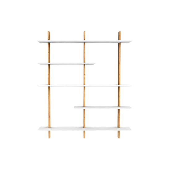 Der er kræset om detaljerne, hvor stolperne er i egefarvet massivt bøg og de medfølgende hylder er udformeret i lakeret MDF. Reolsystemet indeholder her 3 stk. stolper samt 5 hylder.