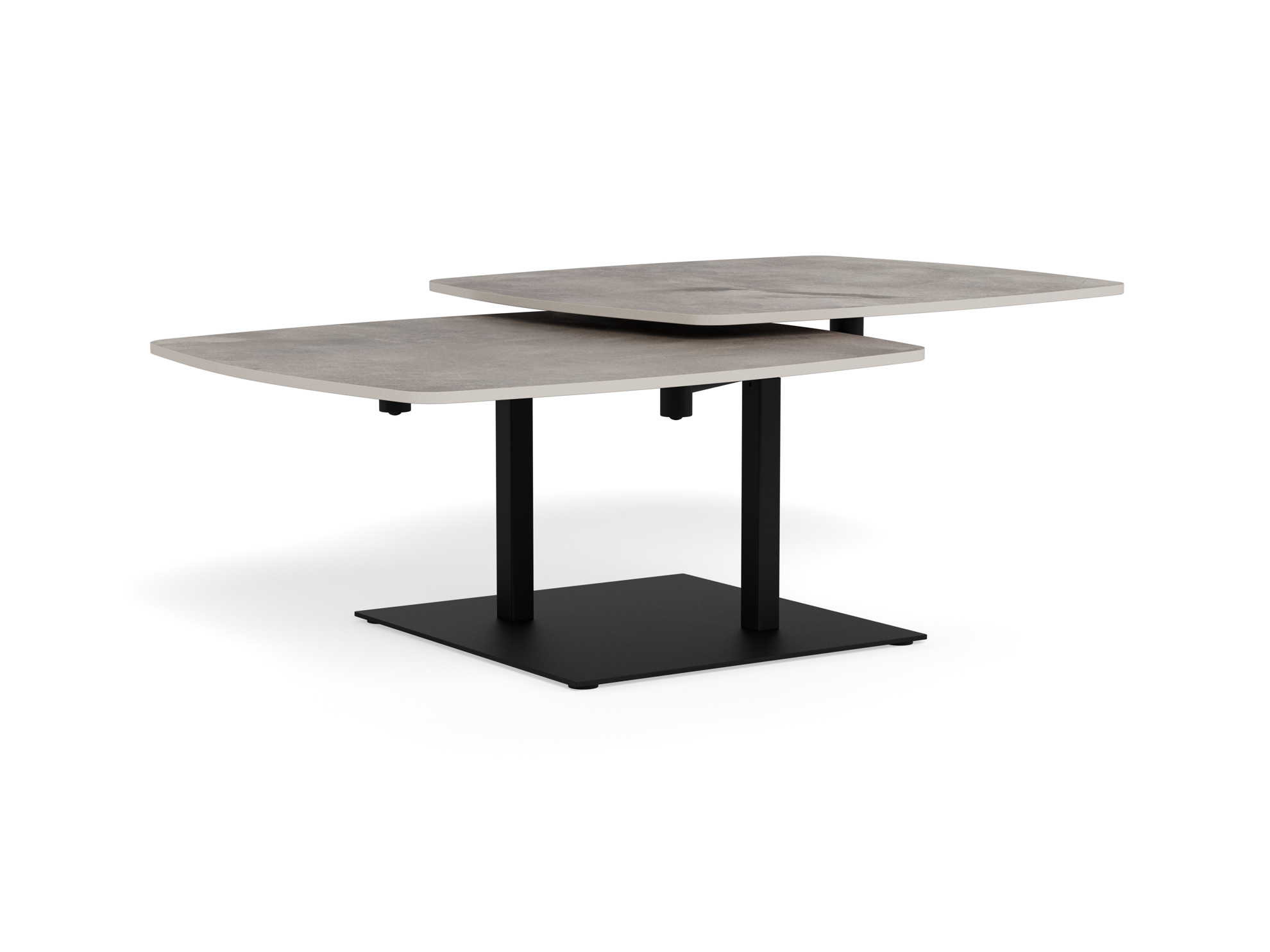 Understellet i mat sort, ru pulverlakeret stål skaber en markant kontrast og fremhæver bordets moderne design. Den integrerede rotationsudtræk-funktion giver fleksibilitet i hverdagen og gør det let at udvide bordets overflade, når der er behov for ekstra plads.