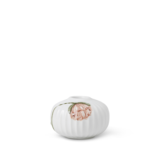 Hammershøi Poppy er en videreudvikling af den populære serie Hammershøi. Serien er designet af Hans-Christian Bauer og Rikke Jacobsen dekorerer med smuk almue akvareldekoration på det hvide porcelæn. Poppy lysestage har en smuk almue akvareldekoration i feminine nude og grønne nuancer, der folder sig fint omkring stagens buede form. Rikke Jacobsen har valgt den sart rosa valmue i sine akvareller for at understrege blomstens skrøbelighed og ynde. Den har noget klassisk, elegant og nordisk over sig – præcis som Hammershøi lysestage, der agerer lærred.