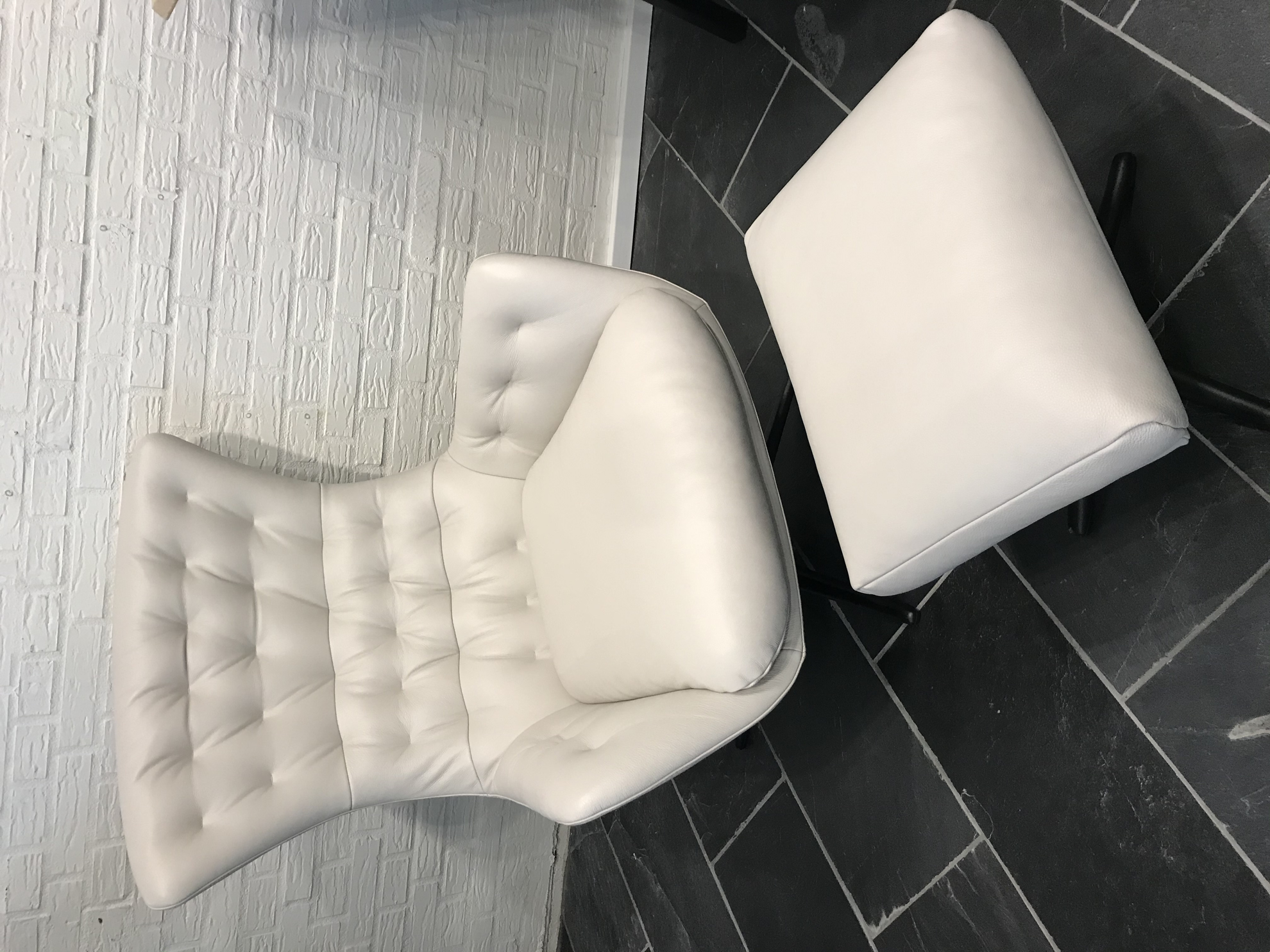 Smuk hvid lænestol og skammel fra Theca. Lænestolen er i hvid læder.