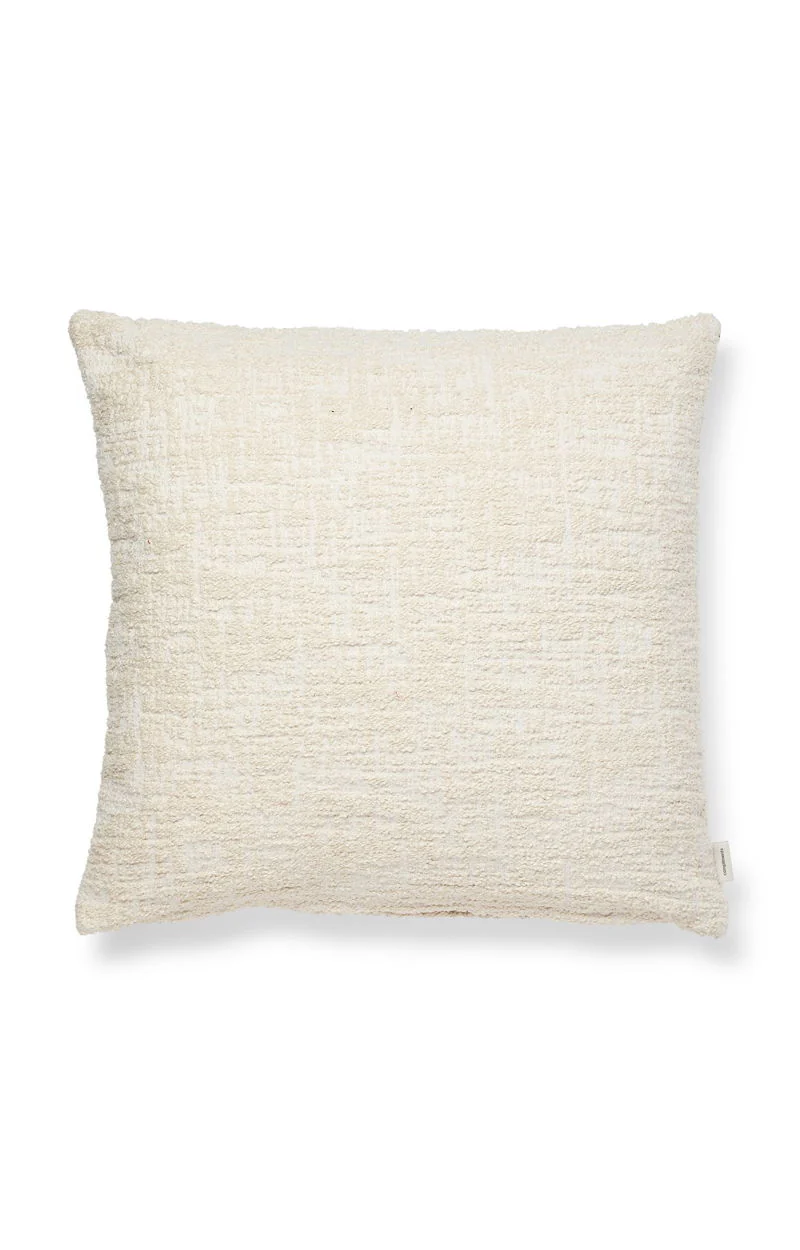 Nora-puden i ecru måler 50×50 cm og er fremstillet af 97 % polyester og 3 % genanvendt bomuld. Med sit bløde boucléstof og rå tekstur skaber puden et smukt tredimensionelt udtryk, der minder om naturens egne overflader. De fine, naturlige toner giver et karakterfuldt og sanseligt element, som tilføjer varme og dybde til indretningen.