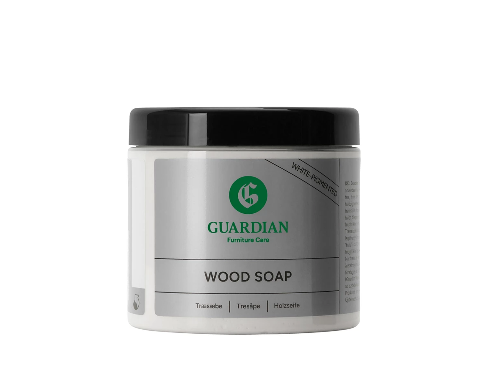 Guardian Træsæbe Hvidpigmenteret anvendes til beskyttelse og pleje af ubehandlet eller sæbebehandlet træ hvor der ønskes en hvidpigmenteret overflade – ”White Wash”. Produktet er kogt på palmekerneolie og kokosolie og indeholder hverken parfume, farve, optisk hvidt eller blegemiddel. Træsæben er færdigblandet og klar til brug. Guardian Træsæbe Hvidpigmenteret er testet af Teknologisk Institut og tildelt ”Indeklimamærket”.