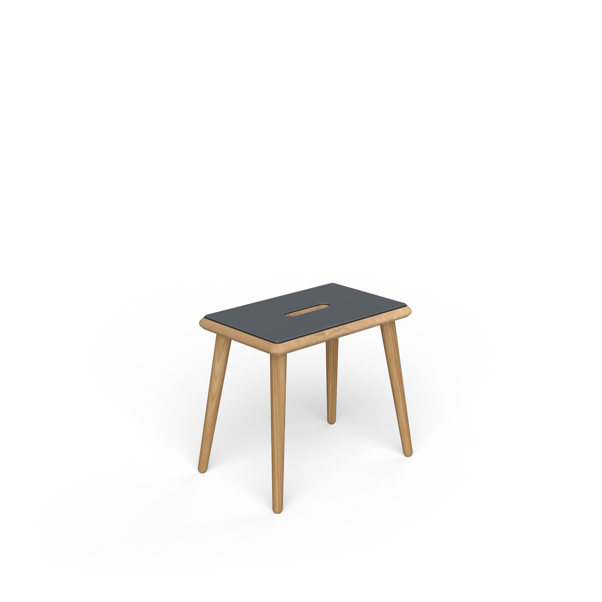 Skamlen er her udført i massivt naturolieret egetræ med en flot bearbejdet kant samt linoleums top i farven "Smokey Blue".