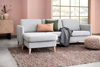 Denne sofa med chaiselong er betrukket med gråt stof i dessin Pico og har træben i eg, som er firkantede og konisk skrå. Sæde- og ryghynderne er vendbare, som gør, at den fanstatiske siddekomfort bibeholdes i længere tid.